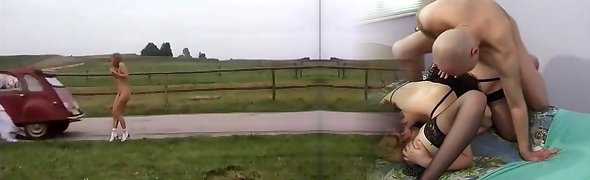 Magnificent classic big-chested blondie in the car gives head to her man
