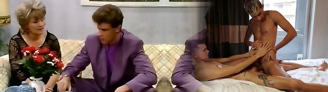 Insane men drilling slutty white classic milf on the bed