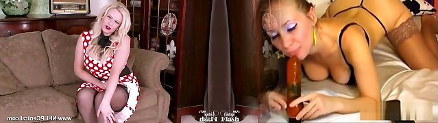 Milf Karina Currie strips off retro lingerie and toys pussy in nylons heels