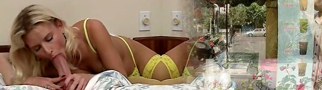 Glorious and beautiful blonde stunner in yellow lingerie sucks big dick