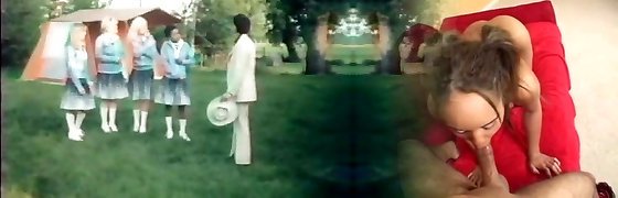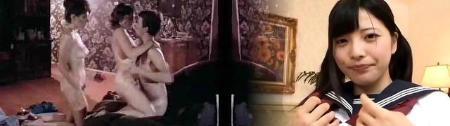 Naughty teens give double deepthroat blowjob in a retro hardcore FFM threesome free-for-all porn clip