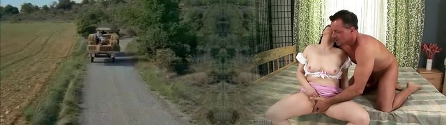 Dark Haired Rene Bonde is outside and getting smashed hard in threesome