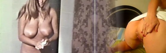 Retro intercourse video with a hot busty girl peeing and taking a bath