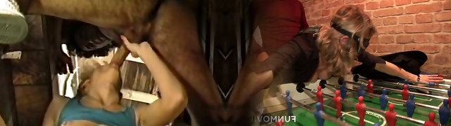 Three sexy German cocksluts pleasing two loaded cocks with their tight fuckholes