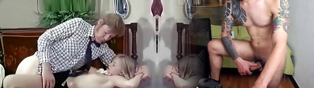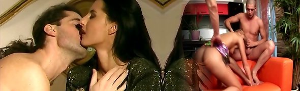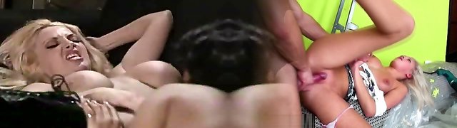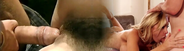 Voracious sex addicted blonde bombshell on the couch gets two dudes