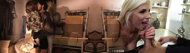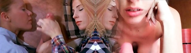 Trio of horny student babes share one man sausage in dorm room - retro
