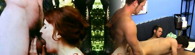 Red head bonny babe gives her ebony mustached guy deep throat blowjob